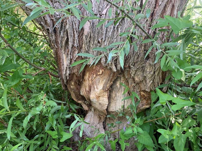 在栖息地附近,阿勒泰地区自然保护协会野外科研工作负责人马驰经常能看到河狸留在树干上的牙印,切口整齐地排列在树枝断面上,这是河狸来过的痕迹,也是其食物来源已出现危机的证据。马驰说:“河狸吃灌木柳比较多,当它们开始啃树干的时候,不亚于人类饿到吃土。”